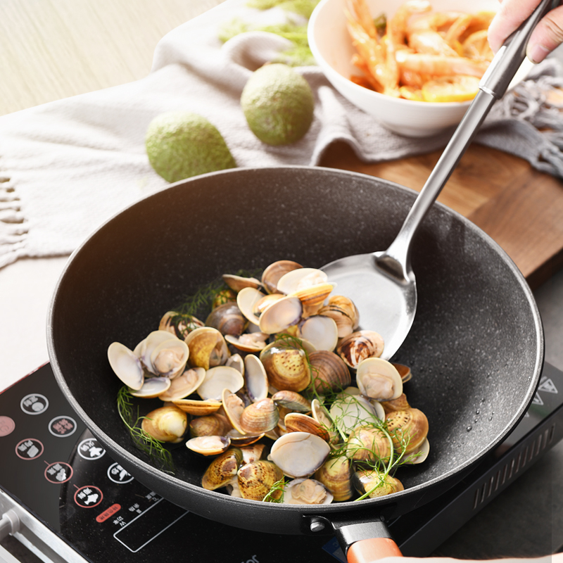 4.煎炸食物時(shí),要達(dá)到不沾鍋底的效果,即先將空鍋加熱至水彈入鍋中會(huì)有小水珠立在鍋中面是不會(huì)被鍋具所吸收,然后擦干水漬加油就可達(dá)到不粘效果?;蛘甙延偷谷脲佒?,開中水火,等2-3分鐘后出現(xiàn)塊狀油紋時(shí),即表示油溫已達(dá)到所需溫度。這時(shí)放入待煎食物就能起到物理性不粘。需要翻面時(shí),先試著用鍋鏟輕推食物,如果能推動(dòng)了,就可以翻一面再煎,如果無法推動(dòng),則需要再煎一會(huì)再翻面,這樣會(huì)確保不粘底,并且能保持食物原來形狀。