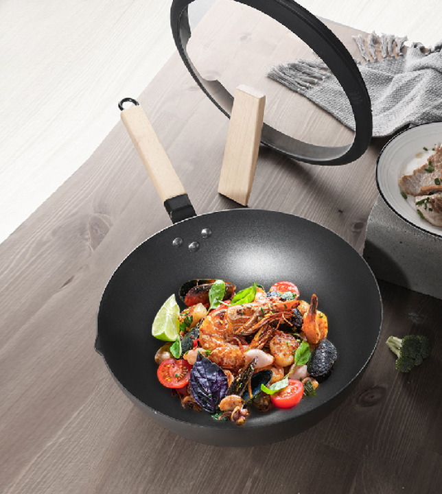 鍋體前高后低設(shè)計烹飪食物輕松翻炒,食物不易飛出鍋外。